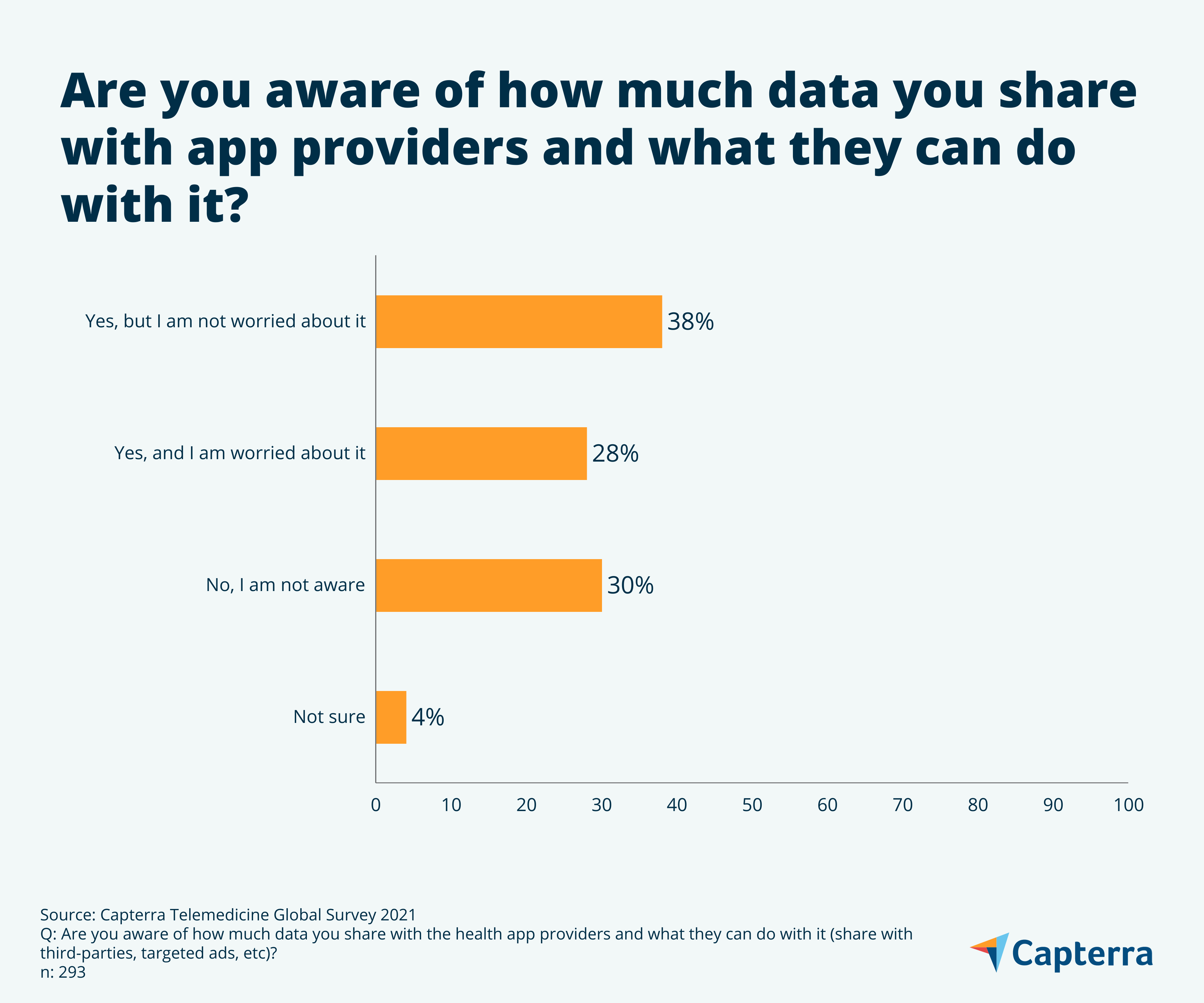 From the remaining respondents, 30% answered that they lacked an awareness as to what healthcare app providers might do with their private details and 4% were “not sure” about how much of their medical data is being stored and possibly used elsewhere.
